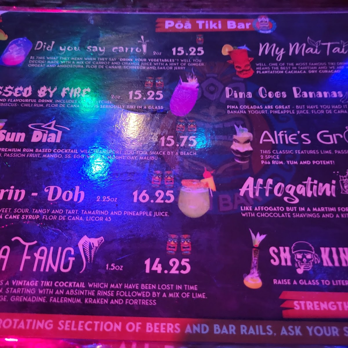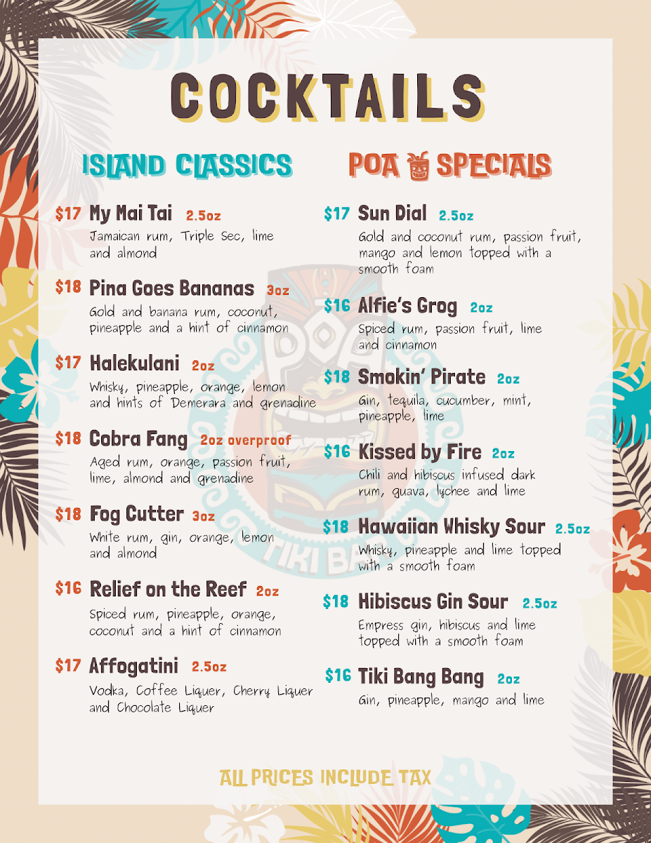 The menu at Poa Tiki Bar offers a relaxed yet vibrant selection, perfectly matching its warm, island-inspired atmosphere. It features casual shareables like Peri Peri Fries and Shrimp Balls that encourage communal enjoyment, ideal for starting an evening with friends or unwinding after a long day.