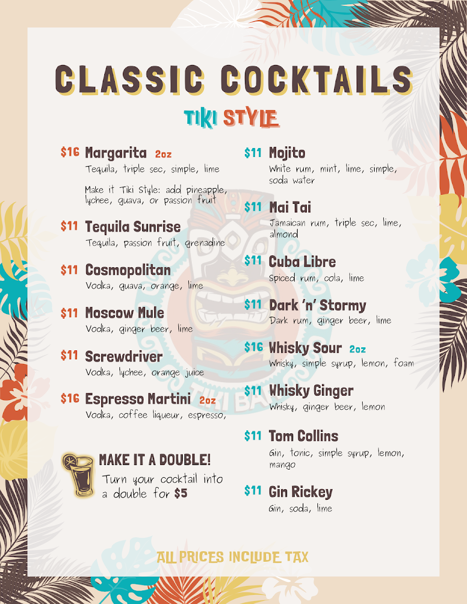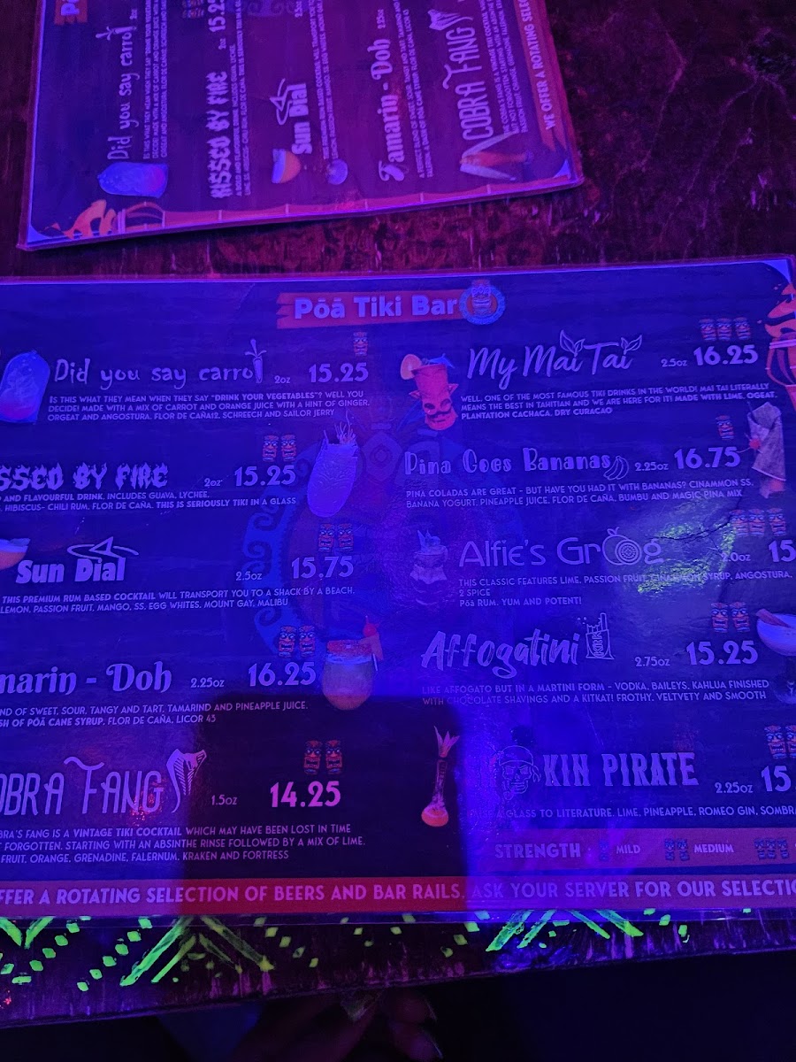 For drinks, the focus is on tiki classics and creative cocktails such as the Carrot Ginger Mocktail or the tropical Tamarin-DOH, which bring a refreshing balance to the rich flavors in the bar’s offerings. These beverages complement the laid-back, exotic vibe that defines the space, making each sip an invitation to slow down and savor the moment.